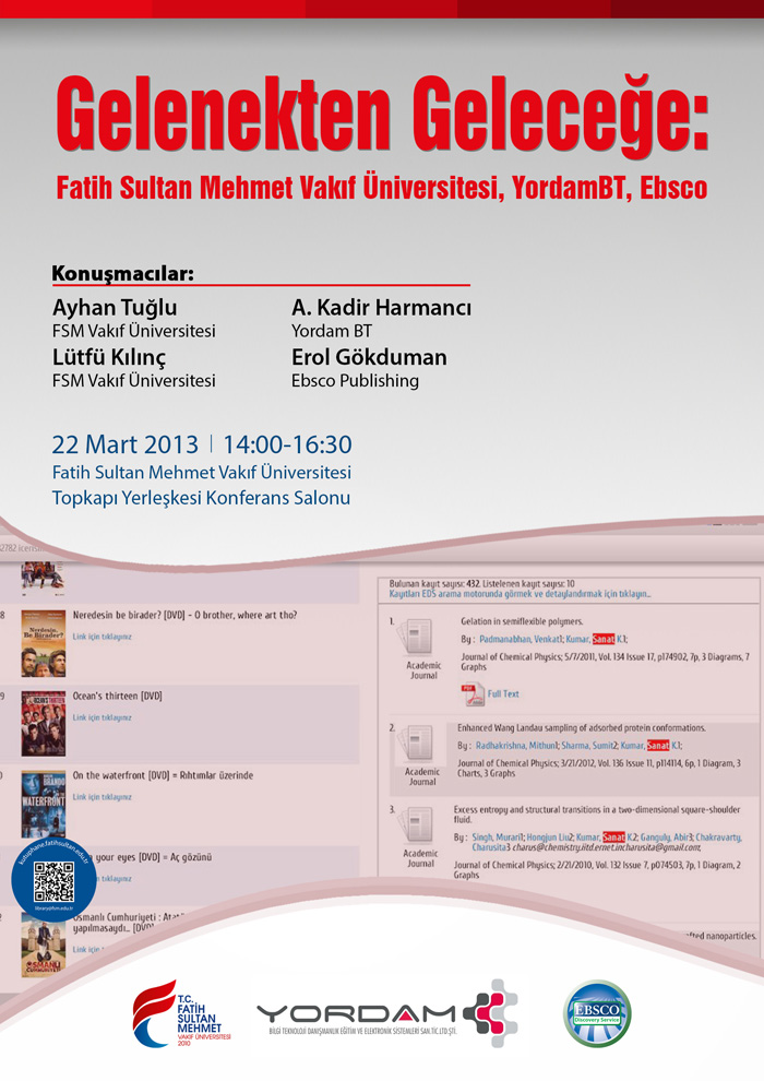 Üniversitemiz Kütüphane Daire Başkanlığı tarafından, 22.03.2013 Cuma günü 14.00-16.30 saatleri arasında Gelenekten Geleceğe: Fatih Sultan Mehmet Vakıf Üniversitesi, YordamBT, Ebsco (yenilikler, yeni uygulamalar) toplantısı yapılacaktır.